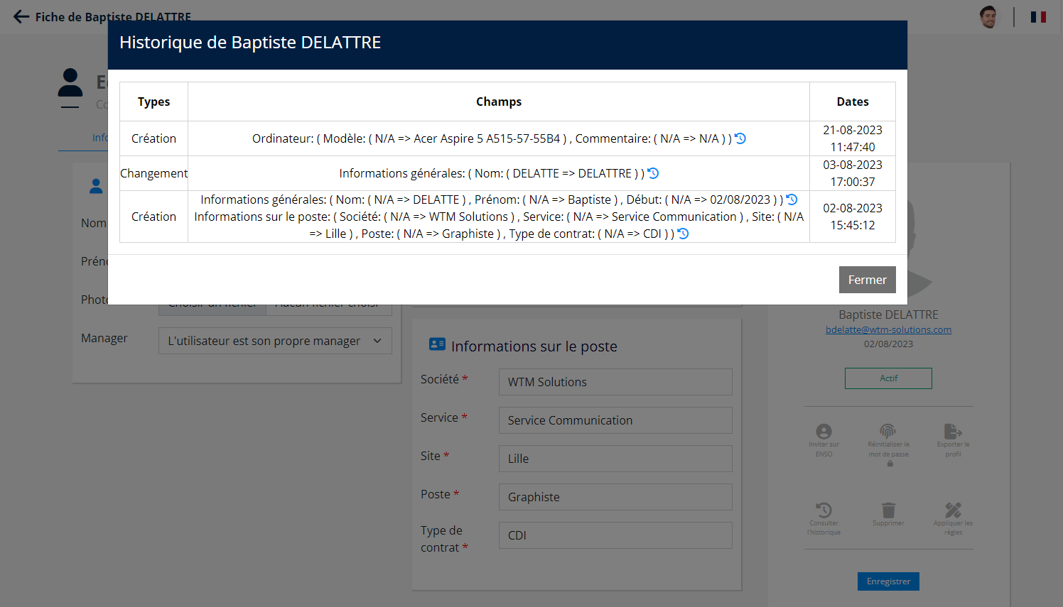 Vous accédez ainsi à l'historique du collaborateur, par exemple :